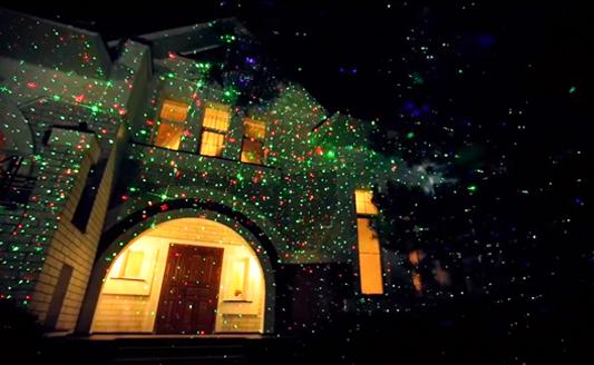 Лазерный проектор создает узор из тысячи точек красного и зеленого цветов на поверхности стен зданий, потолков дома или деревьев на улице за счет дифракционной линзы дробящей световой пучок. Выполнен из морозостойких материалов для работы в условиях Русской зимы.